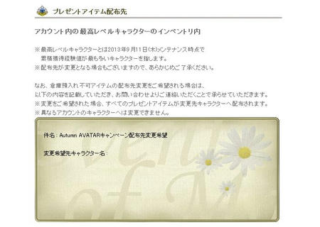※変更をご希望された場合、すべてのプレゼントアイテムが変更先キャラクターへ配布されます。