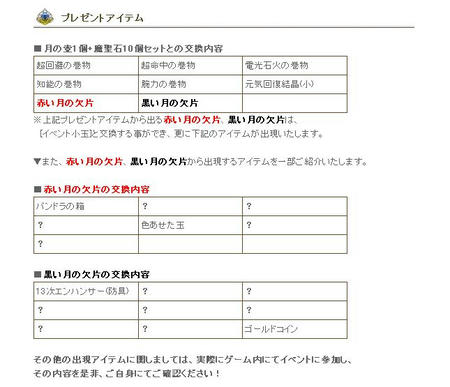 ※上記プレゼントアイテムから出る赤い月の欠片、黒い月の欠片は、