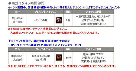 イベント期間中、累計接続時間469(シルク)分を超えたアカウントに以下のアイテムをプレゼント