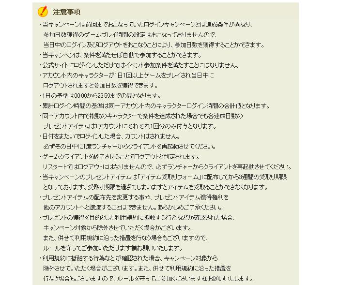 ログイン時間に関係なく、1日中に1回ゲーム内にログイン&ログアウトで参加日数を獲得。