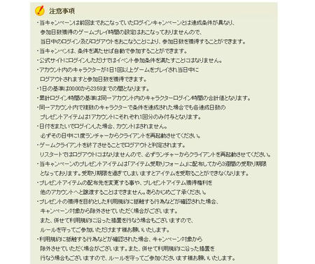 累積ログイン時間部門に設定されたアイテムは、累積ログイン時間が一定時間以上になると条件を満たしたアイテムを獲得か抽選権利を得ることが可能になる。