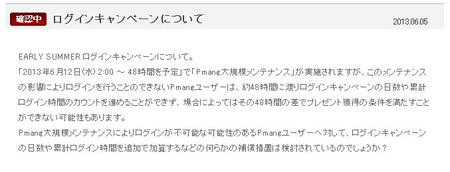 「2013年6月12日(水) 2:00 ~ 48時間を予定」で「Pmang大規模メンテナンス」が実施されますが、このメンテナンスの影響によりログインを行うことのできないPmangユーザーは、約48時間に渡りログインキャンペーンの日数や累計ログイン時間のカウントを進めることができず、場合によってはその48時間の差でプレゼント獲得の条件を満たすことができない可能性もあります。