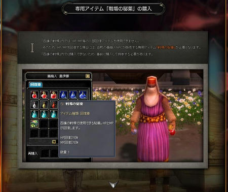 →「戦場の秘薬」 百錬の戦場で使用できる秘薬。HPとMPが回復します。/HP70%回復/MP70%回復