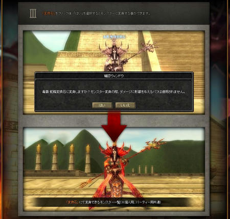 →「百錬の戦場」内部にある「変換石」を使用することで、モンスターに変身することが可能