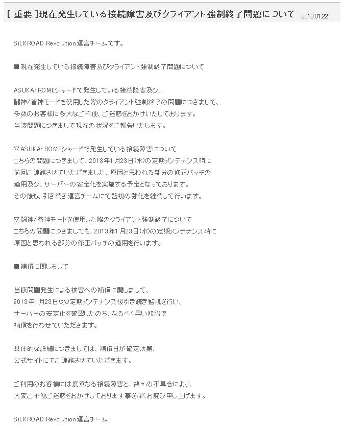 それ以降は接続障害の告知は出ず、1月30日に接続障害への補償案内。