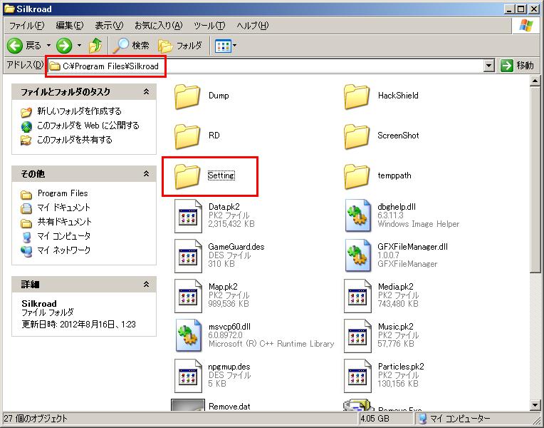 シルクをインストールしてある場所は初期設定なら「C:\Program Files\Silkroad」です。