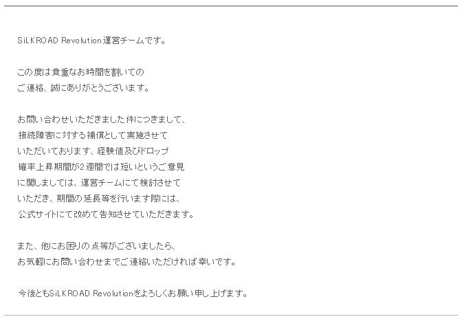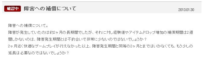 障害が発生していたのは約2ヶ月の長期間でしたが、それに対し経験値やアイテムドロップ増加の補償期間は2週間しかないのは、障害発生期間とは不釣合いで非常に少ないのではないでしょうか?
