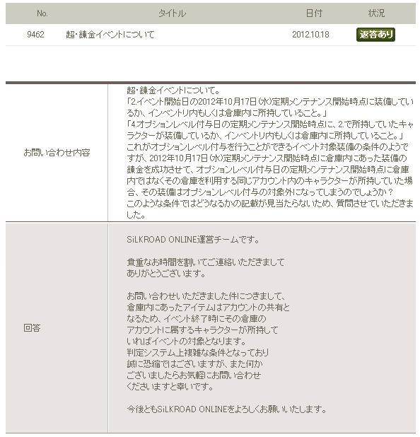 これがオプションレベル付与を行うことができるイベント対象装備の条件のようですが、2012年10月17日(水)定期メンテナンス開始時点に倉庫内にあった装備の錬金を成功させて、オプションレベル付与日の定期メンテナンス開始時点に倉庫内ではなくその倉庫を利用する同じアカウント内のキャラクターが所持していた場合、その装備はオプションレベル付与の対象外になってしまうのでしょうか?
