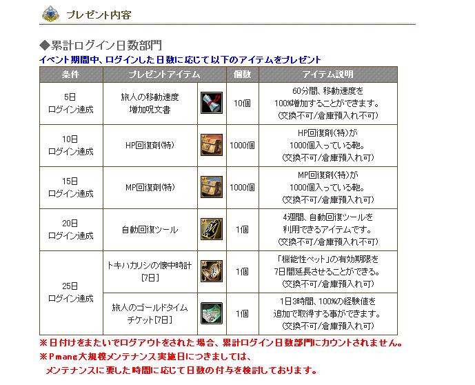 イベント期間中、ログインした日数に応じて以下のアイテムをプレゼント
