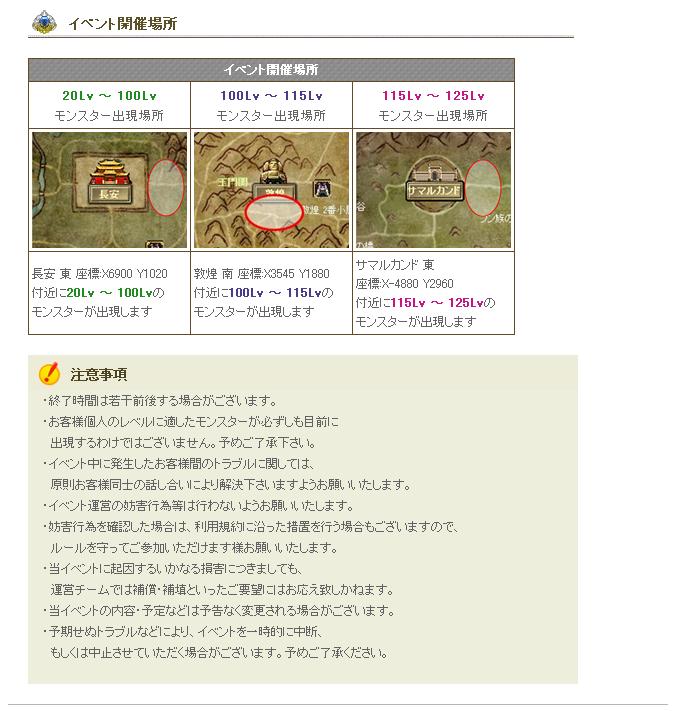長安 東 座標:X6900 Y1020付近に20Lv ~ 100Lvのモンスターが出現します