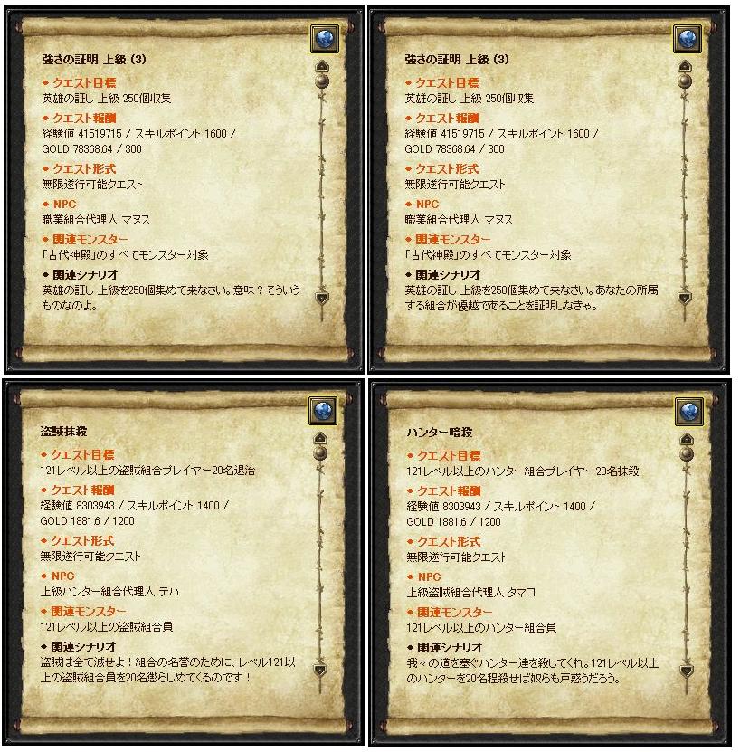 内容 神殿内で121レベル以上の盗賊組合員ユーザーを20名退治