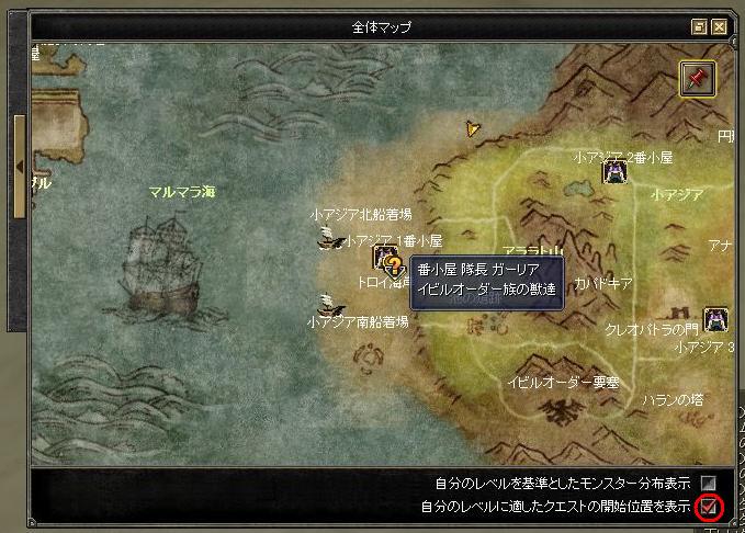 赤丸で囲った場所のチェックを入れると、、マップ上に受けられるクエの位置が表示されます。