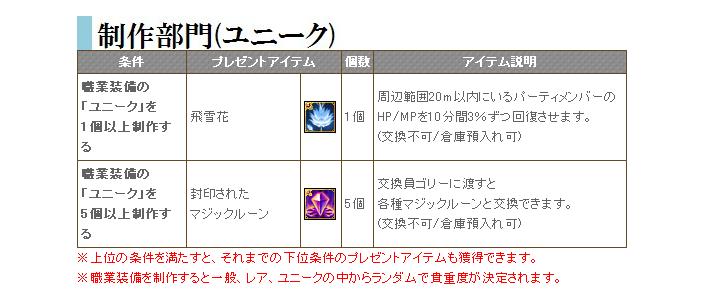 制作部門(ユニーク)の条件「職業装備の「ユニーク」1個以上制作する」のプレゼントアイテムが「飛雪花」ということになっていますが、アイテム説明では「周辺範囲20m以内にいるパーティメンバーのHP/MPを10分間3%ずつ回復させます。」となっています。