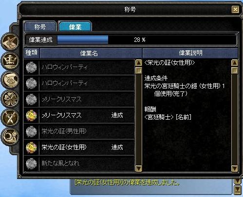 偉業を達成したのは女性用で、ログ表示も偉業リスト上でも女性用達成の表示。