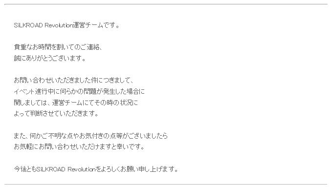 当イベントの中止は全てSiLKROAD Revolution運営チームの不手際によるものであり、