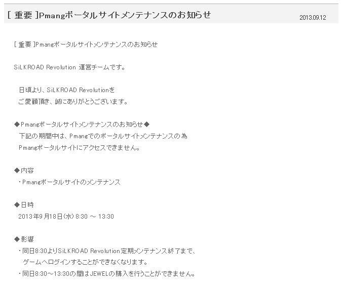 2013年9月18日(水)定期メンテナンス終了後 ~ 2013年9月25日(水)定期メンテナンス開始まで