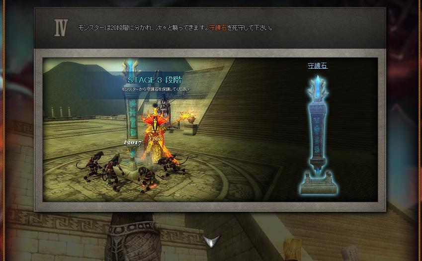 →20段階に分かれて出現するモンスターから守護石を守りきるのがクリア条件